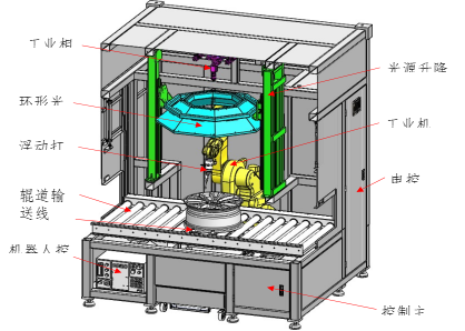 去毛刺系统包含辊道线、轮毂夹具、视觉定位单元、机器人系统、去毛刺单元、控制系统和机架等部件,其中视觉定位单元包括相机、镜头、相机调平机构、顶部可升降光源,顶部可升降光源用于轮毂型号识别和定位;机器人系统包括机器人和控制器;去毛刺单元包括去毛刺浮动主轴、去毛刺刀具、吹气装置和换刀配件等,去毛刺系统硬件组成如